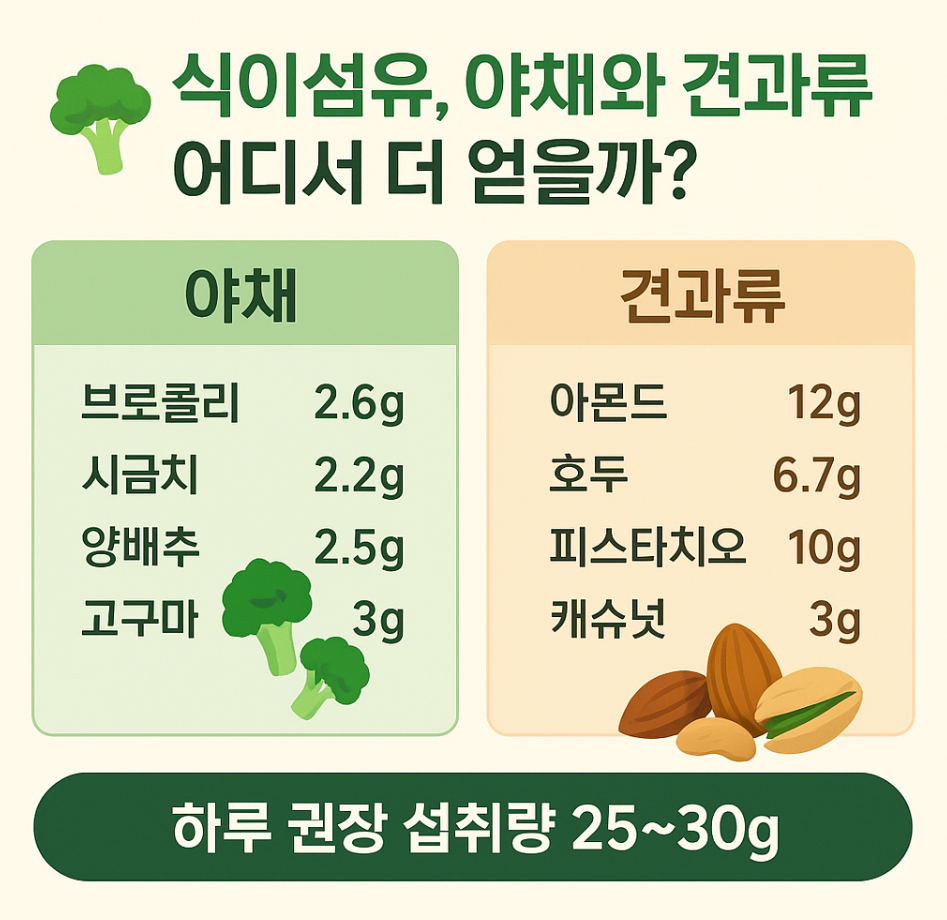 즉, 야채는 “많이 먹어도 부담 없는 섬유질 공급원”, 견과류는 “적은 양으로도 섬유질과 영양을 동시에 제공하는 고밀도 식품”이라고 정리할 수 있습니다.